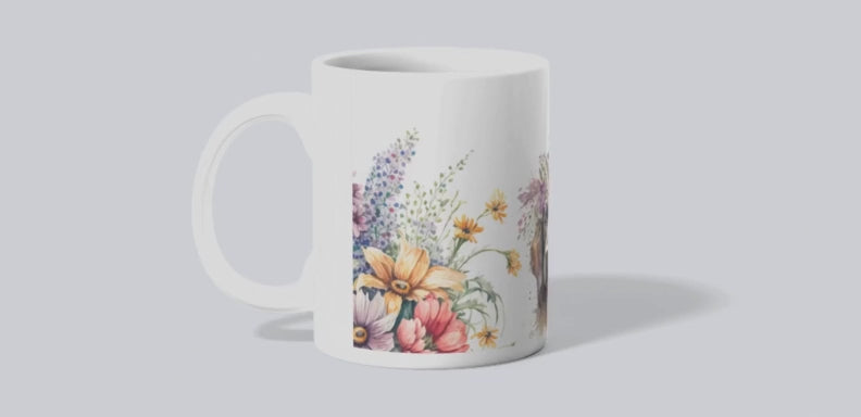 Actual mug image goes from the top of the mug to the very bottom. Dishwasher and microwave safe, except for the wooden handle mug that is hand wash only.