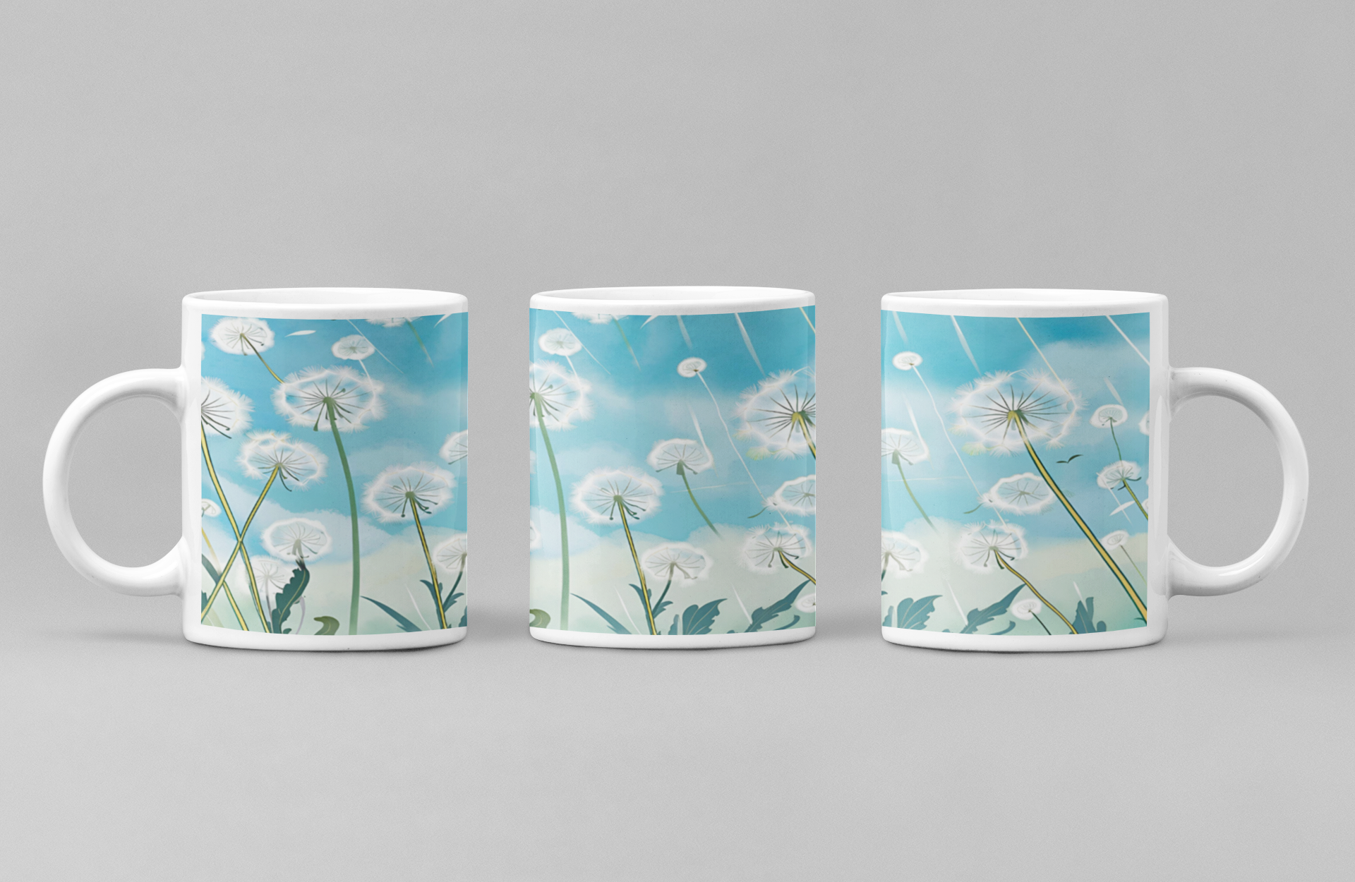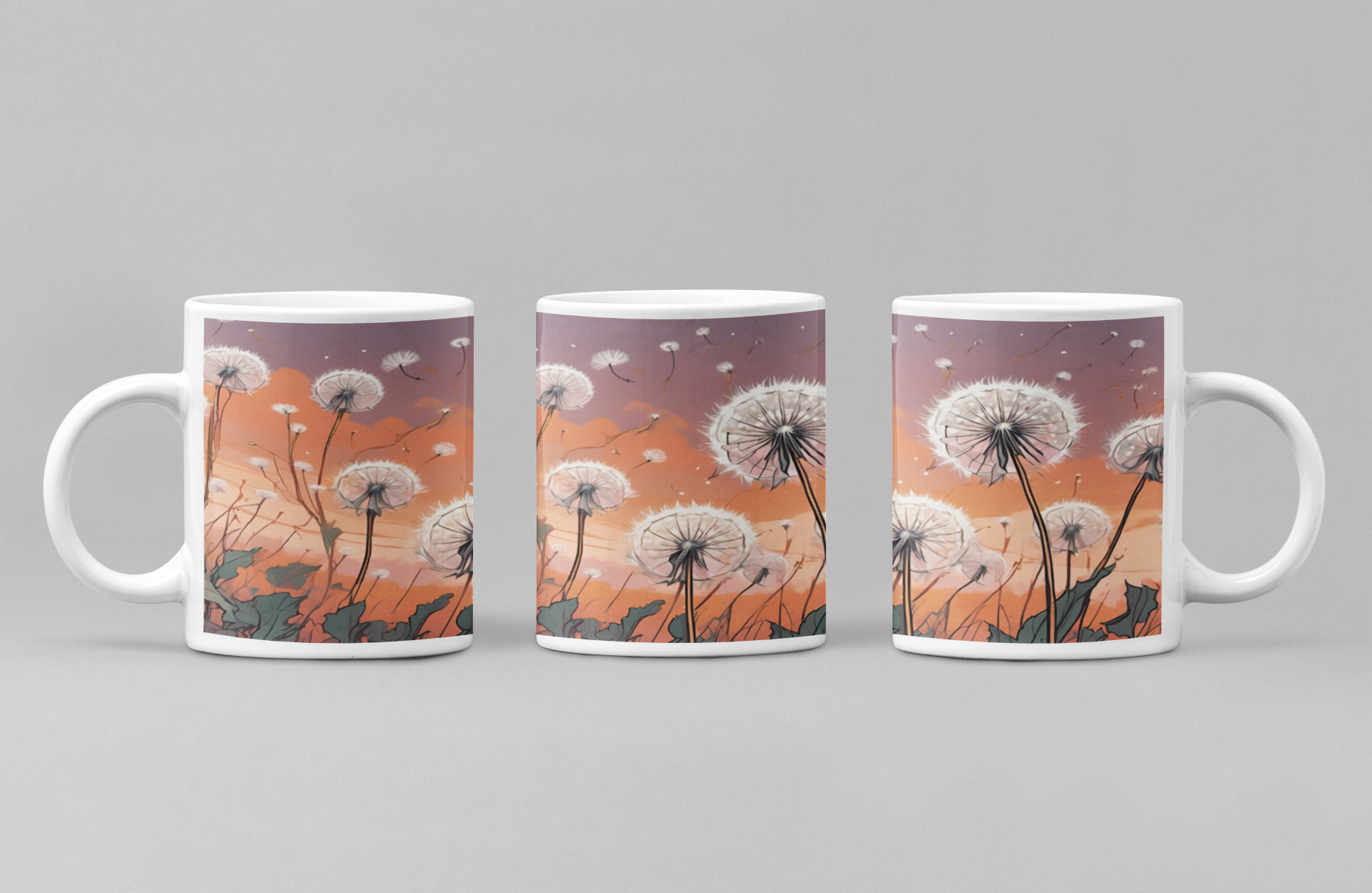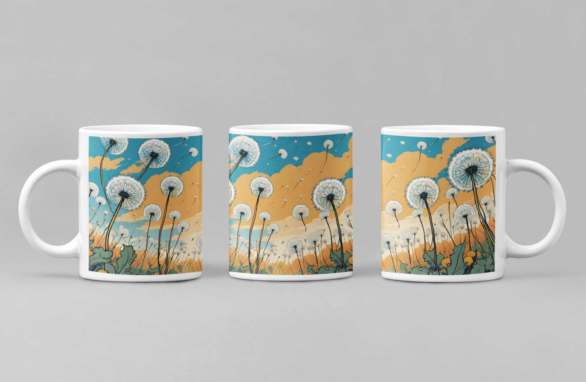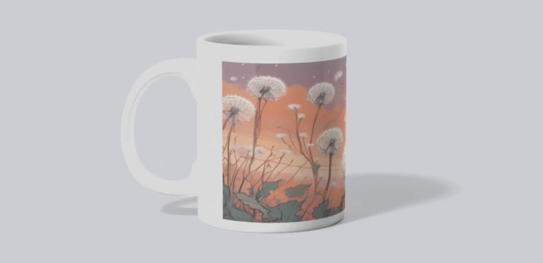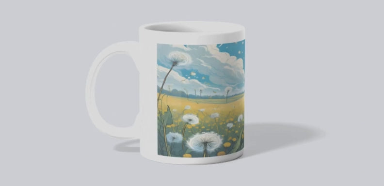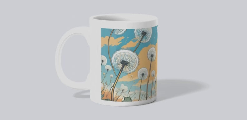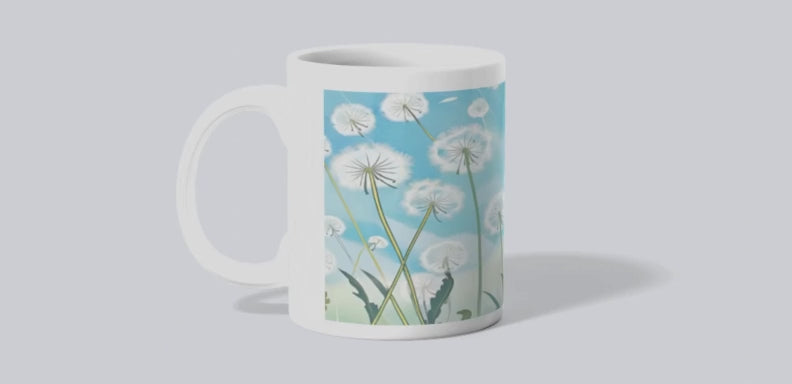 As photographed 4 different designs are available for the Dandelions. The actual mug images goes from the top of the mug to the very bottom. Dishwasher and microwave safe. Wooden handle mug is hand wash only.