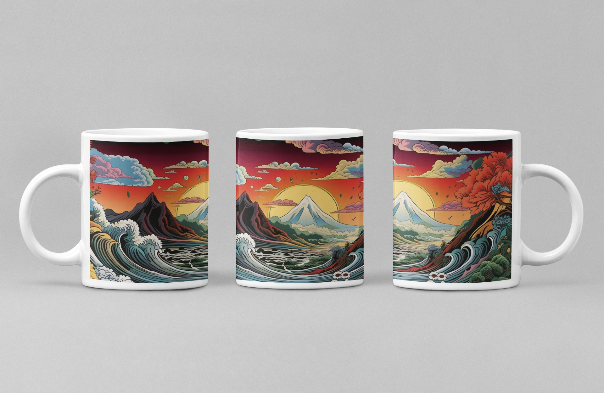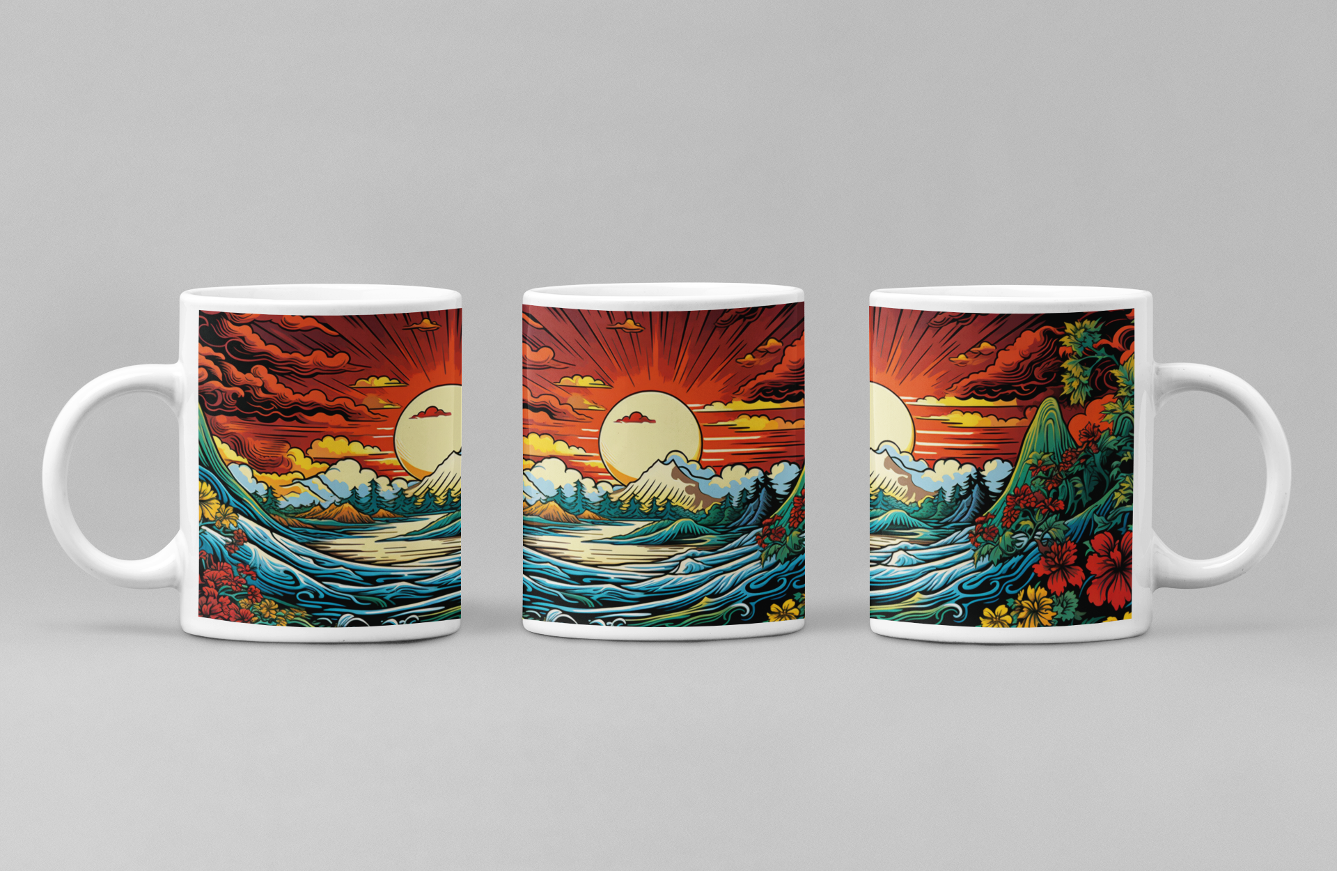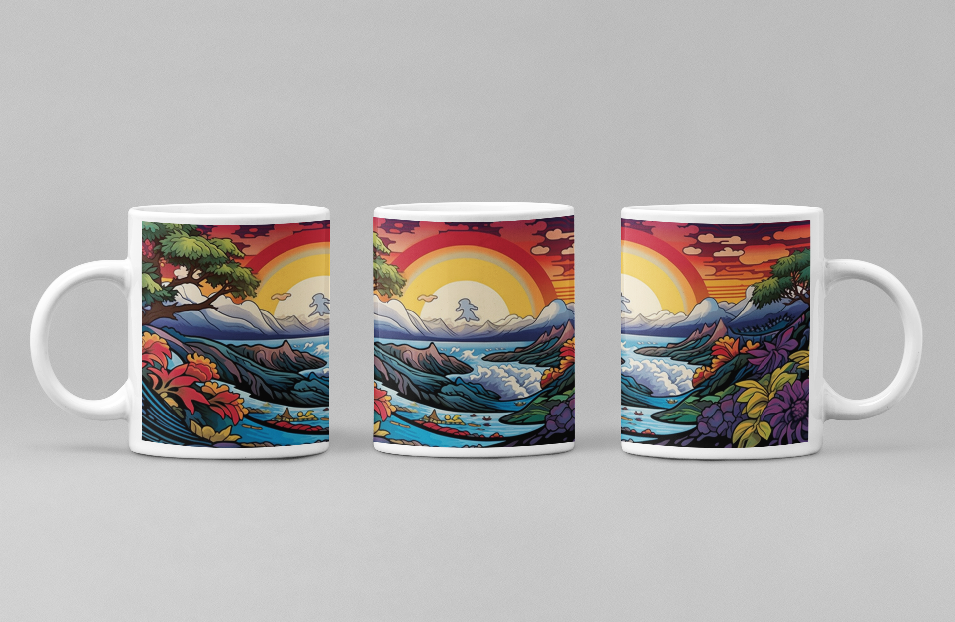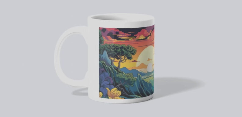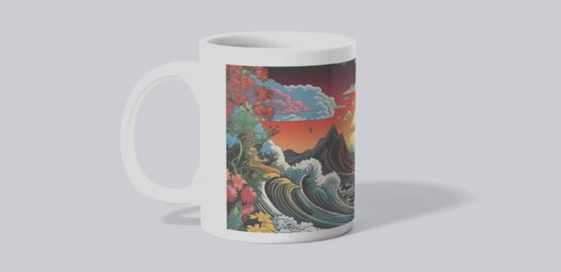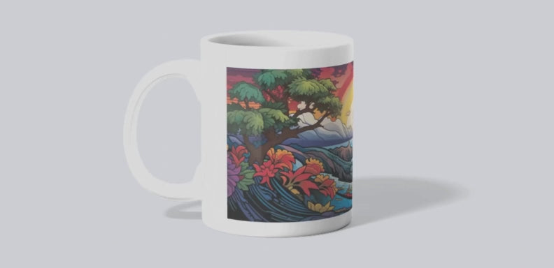 The actual mug image goes from the top of the mug to the bottom. Dishwasher and microwave safe. Wooden handle mug is hand wash only.